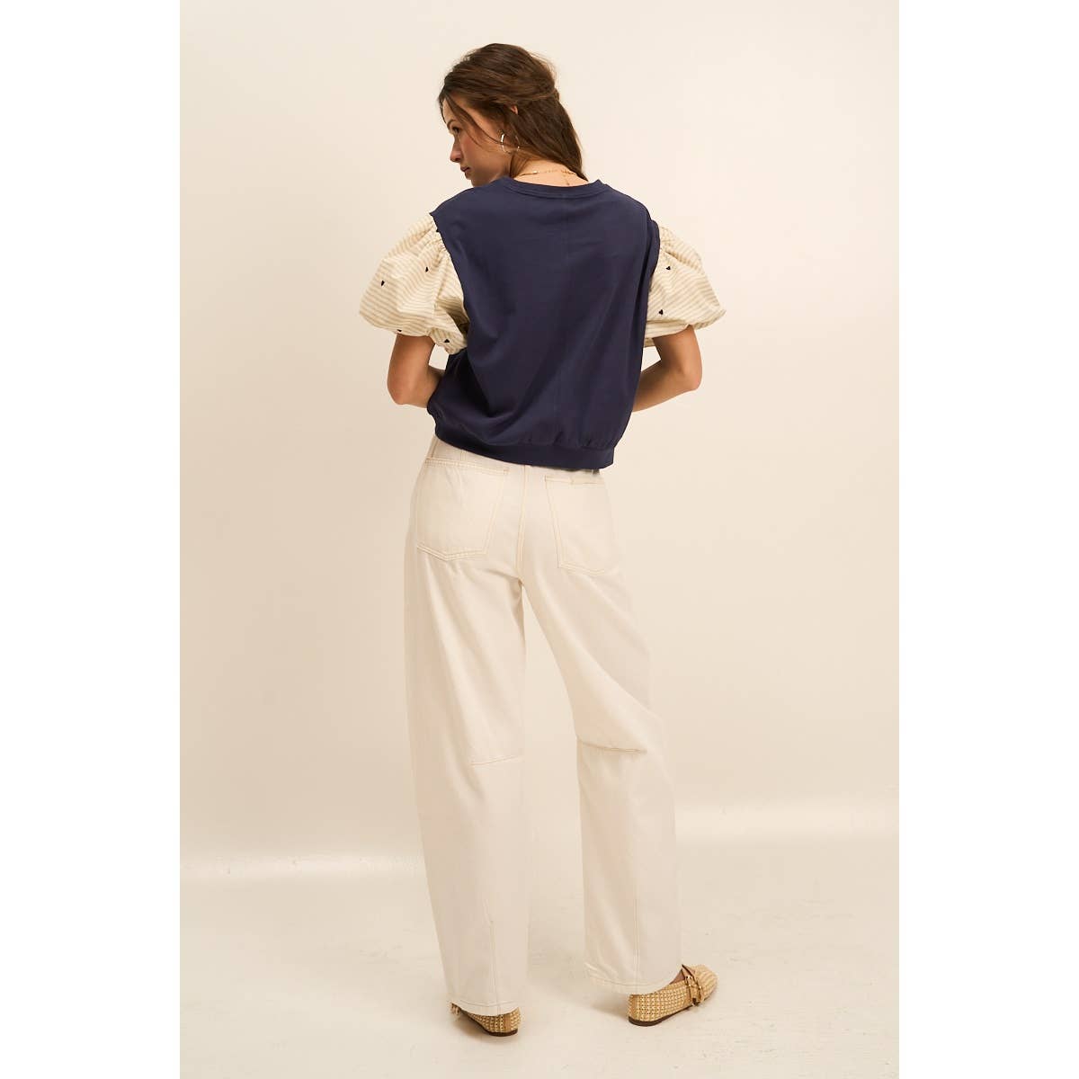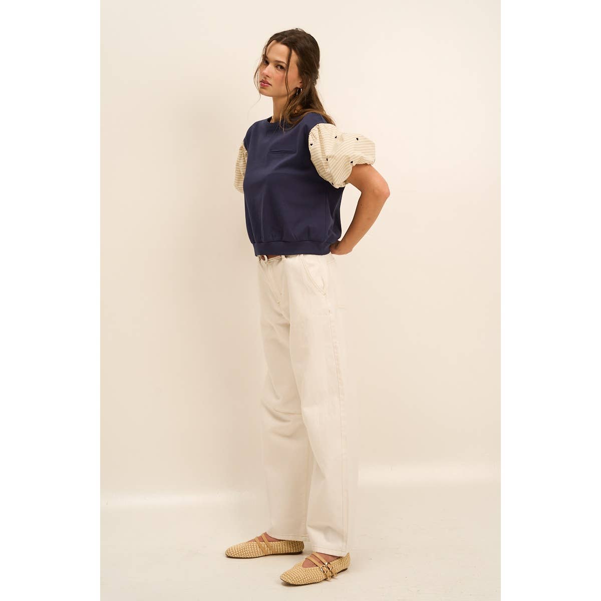 The contrast between the self and sleeves of this top brings a minimalist look while the soft stripes and hearts bring back the femininity. The puff sleeves adds a princess vibe to the top while the faux front pocket keeps its modern feel. The fitted bottom seam brings together the overall fit giving the wearer a pretty, upscaled top perfect for the Fall time. S: 85% cotton 15% polyester C: 80% cotton 20% spandex