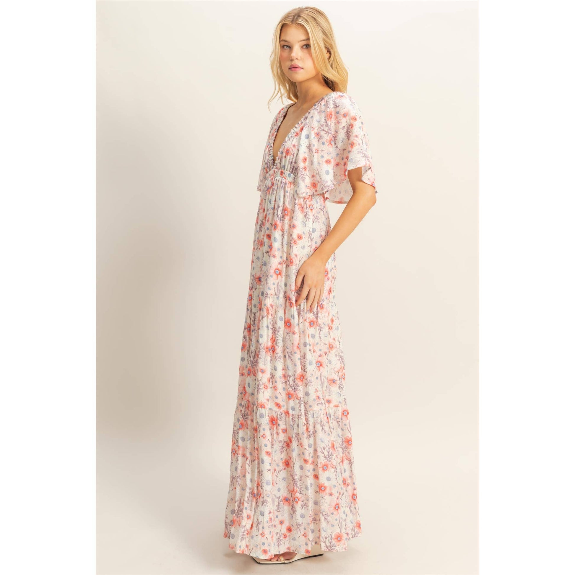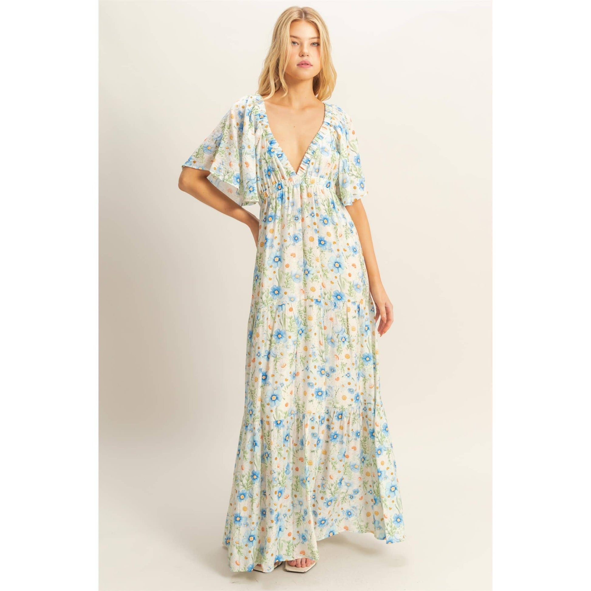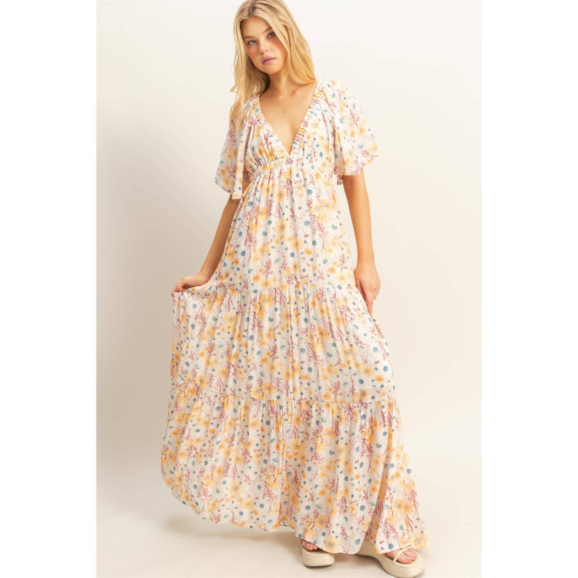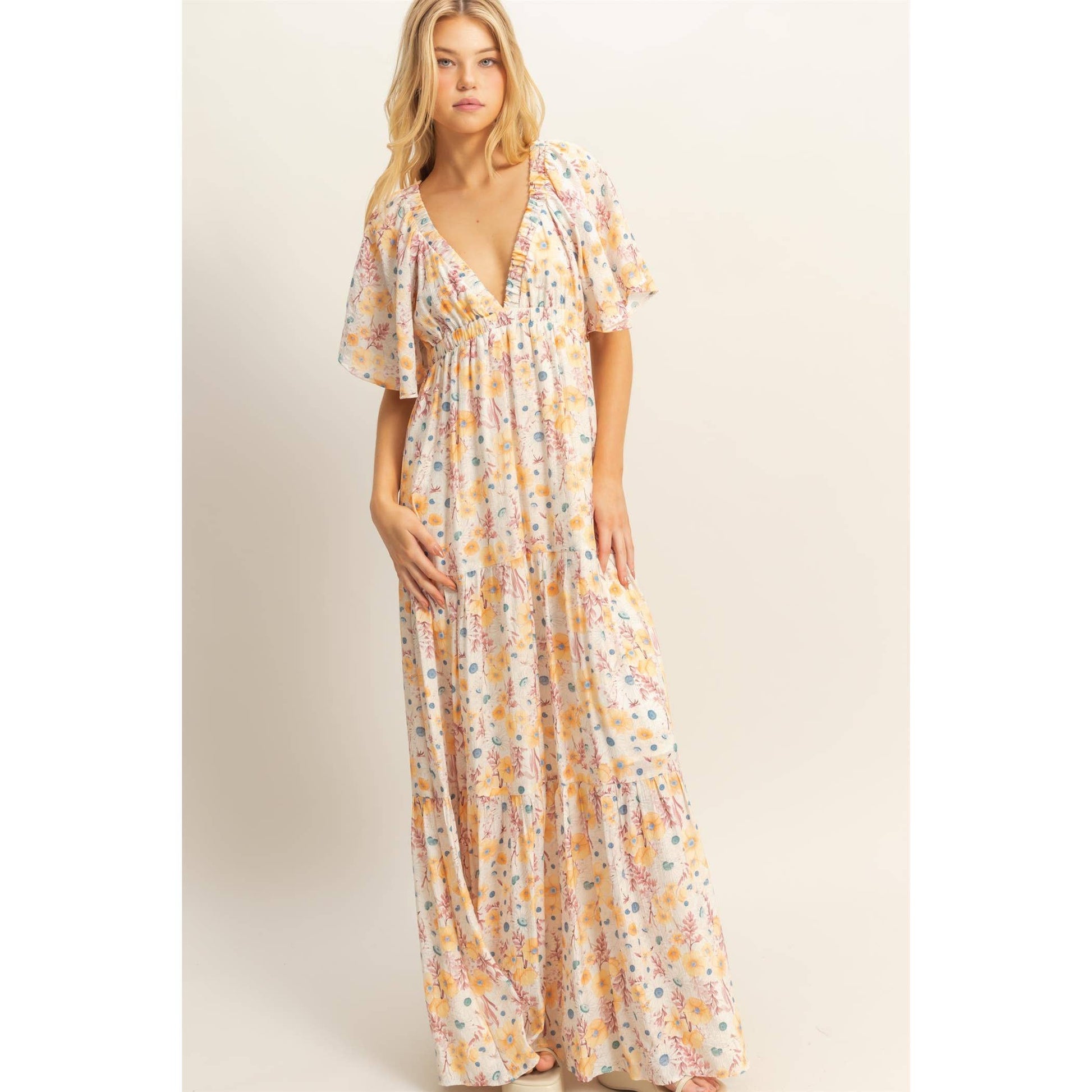 Decorated With A Floral Print All Over, This Dress Features A Plunging V-Neckline With Flowy Sleeves And An Elasticized Band Below The Bust. The Dress Features Gathered Detailing That Leads To A Flowy Maxi Hem, Completed With Tiered Detailing. 75% Rayon 25% Polyamide Model Is 5' 7" Tall, 32" Chest, 25" Waist, 34" Hips And Wearing A Size Small