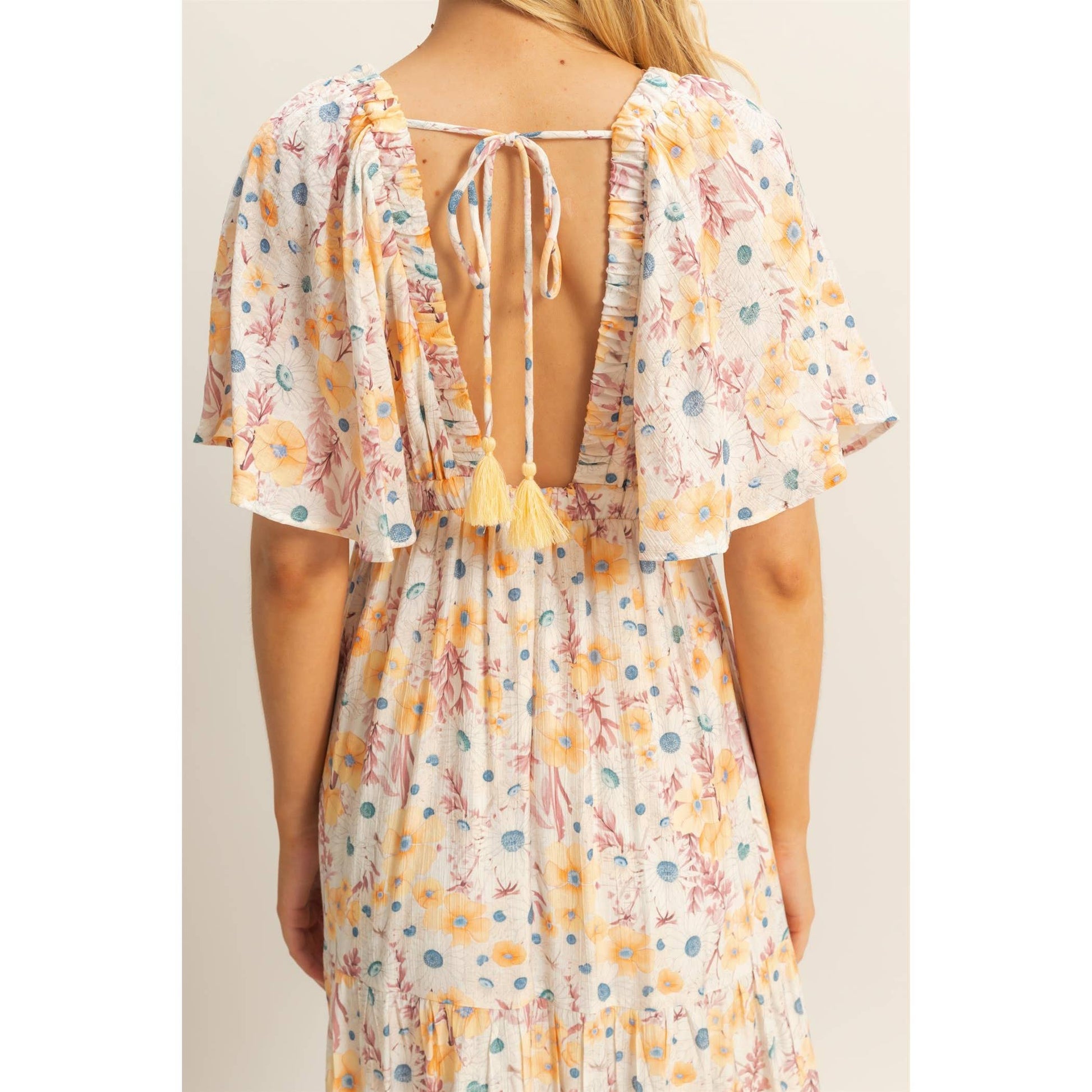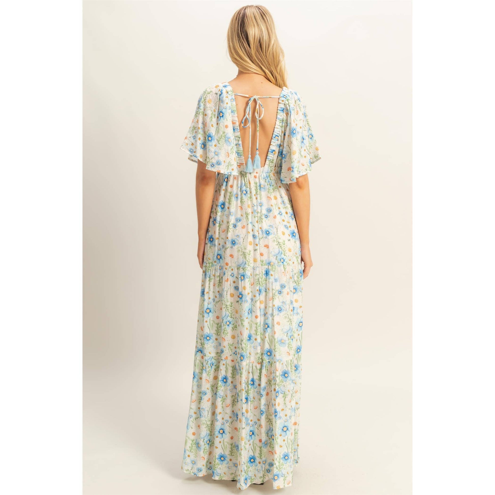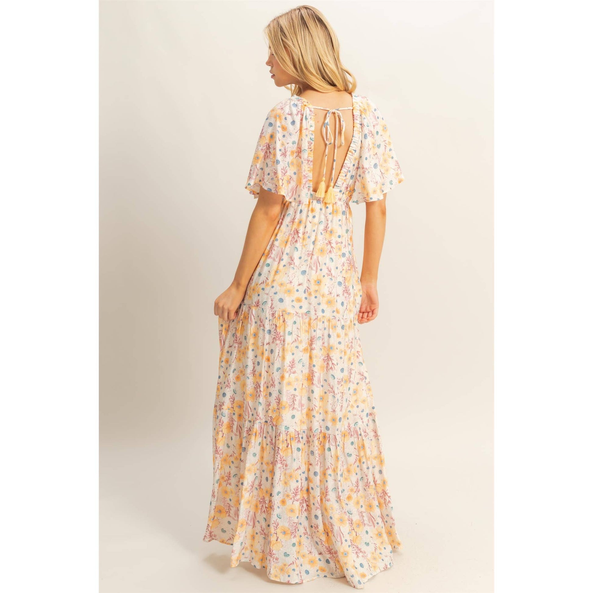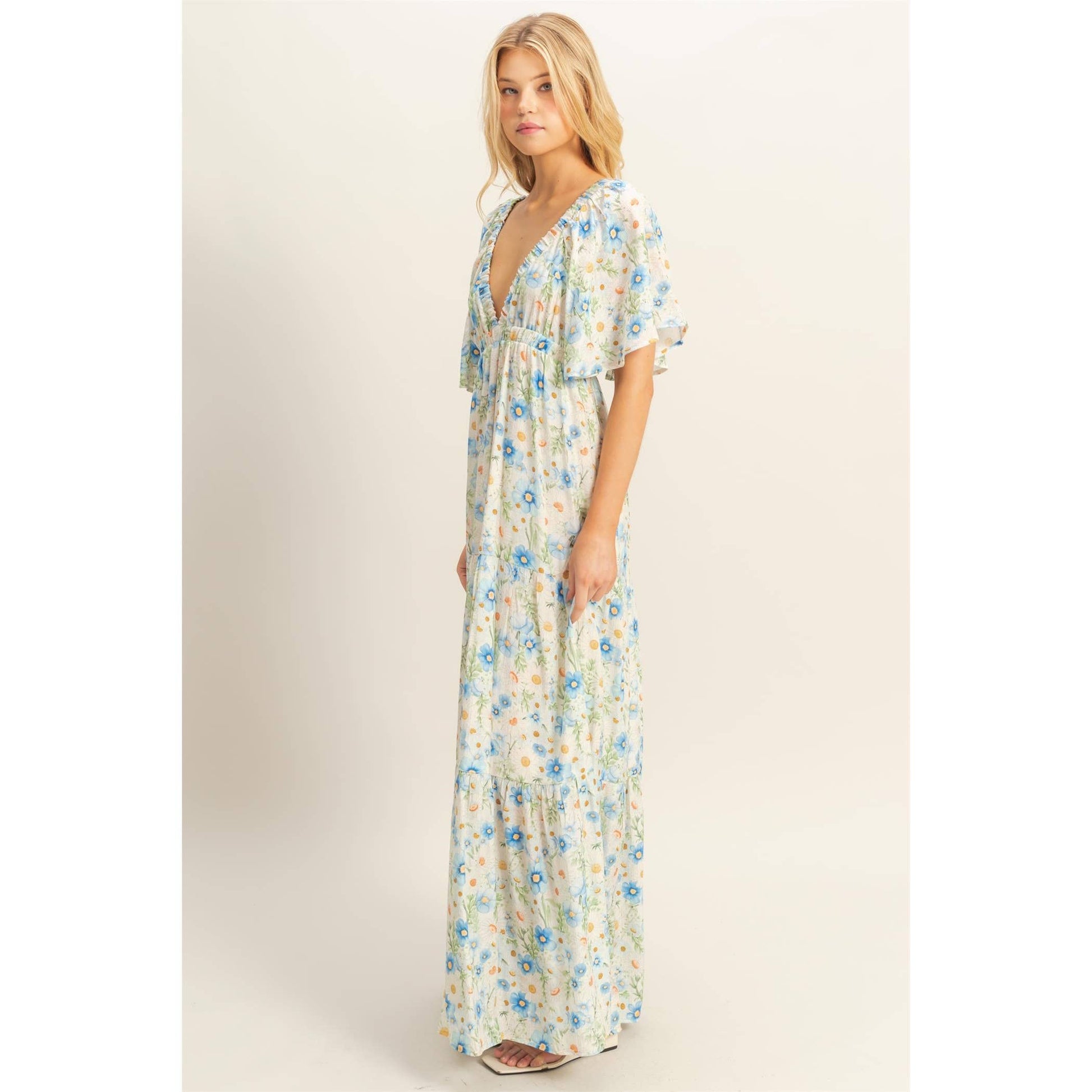 Decorated With A Floral Print All Over, This Dress Features A Plunging V-Neckline With Flowy Sleeves And An Elasticized Band Below The Bust. The Dress Features Gathered Detailing That Leads To A Flowy Maxi Hem, Completed With Tiered Detailing. 75% Rayon 25% Polyamide Model Is 5' 7" Tall, 32" Chest, 25" Waist, 34" Hips And Wearing A Size Small