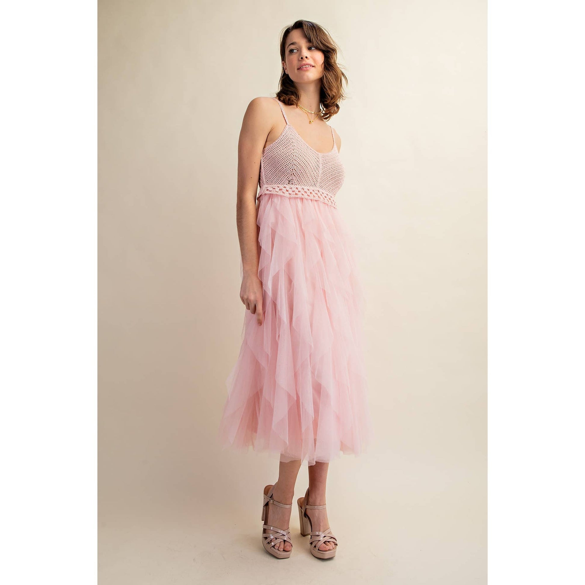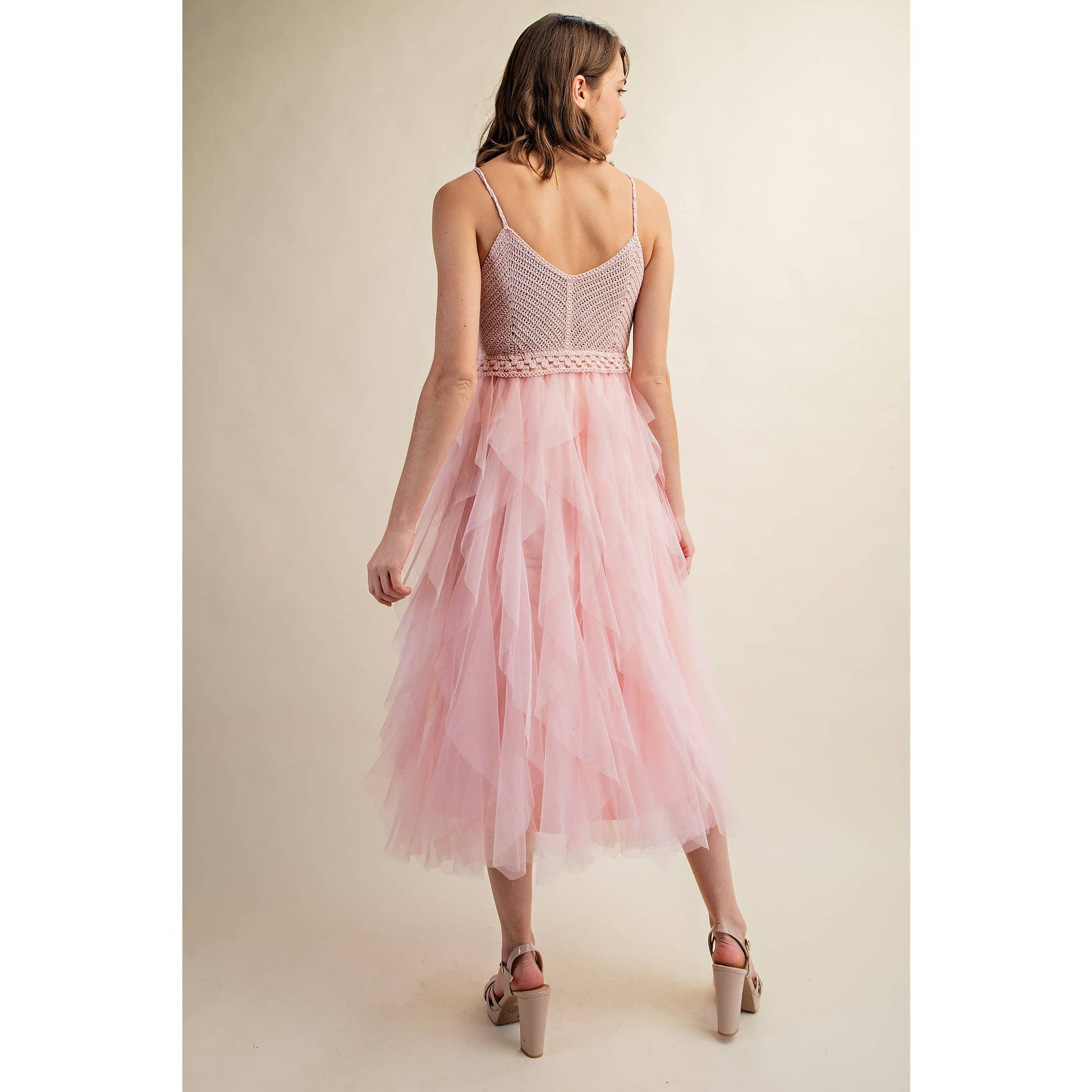 Romantic and effortlessly elegant, this Tulle Midi Crochet Dress features a beautifully crafted crochet top with delicate shoulder straps and a flattering heart-shaped neckline. The little elastic shirring at the waist ensures a comfortable, adjustable fit, while the free-flowing tulle skirt creates a dreamy, graceful silhouette. Fully lined with a shorter skirt inside for coverage, this dress is perfect for weddings, garden parties, or any special occasion.