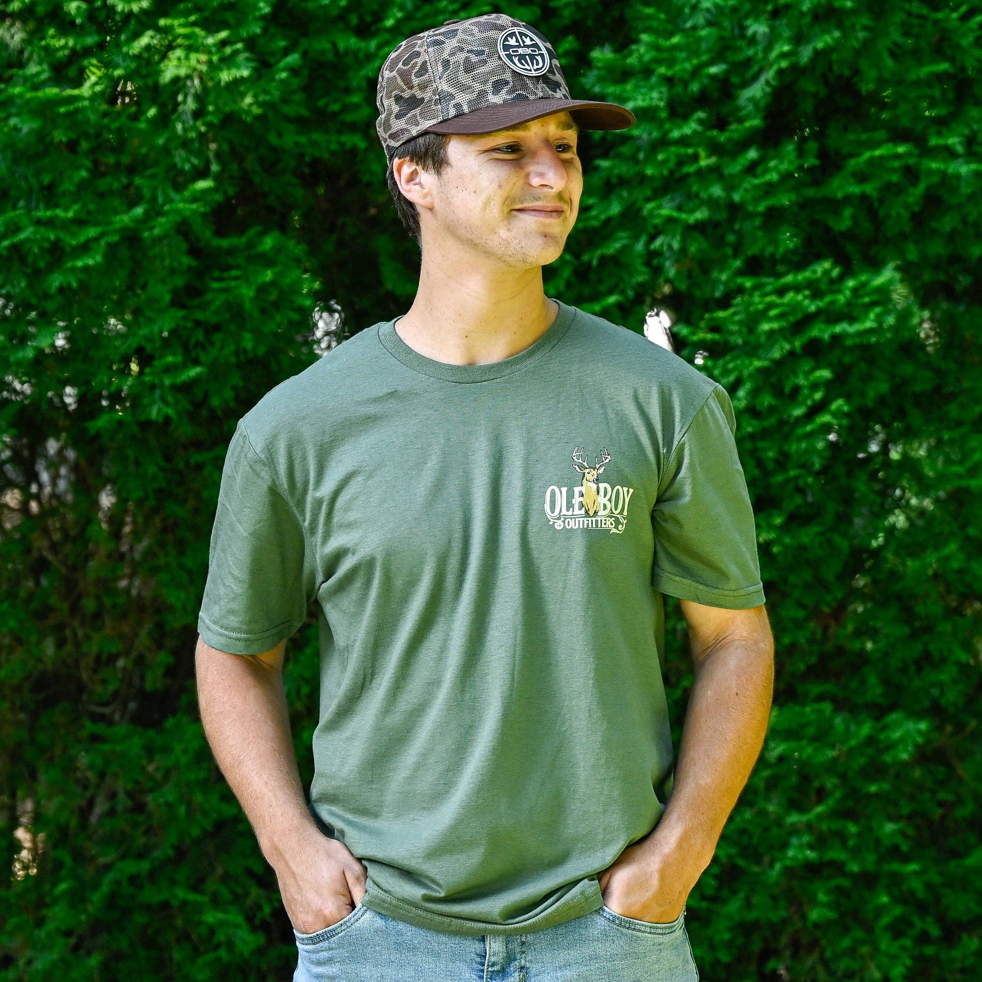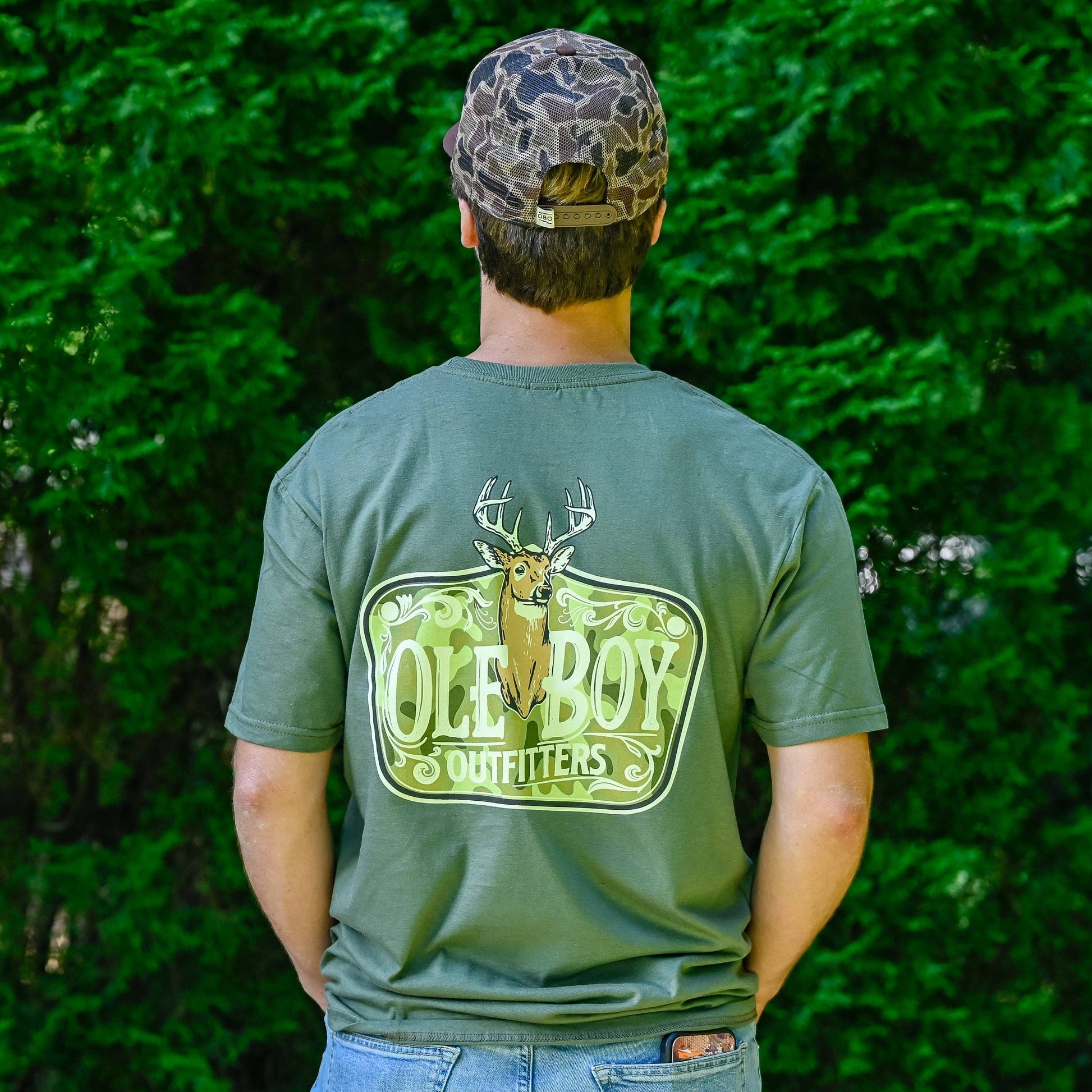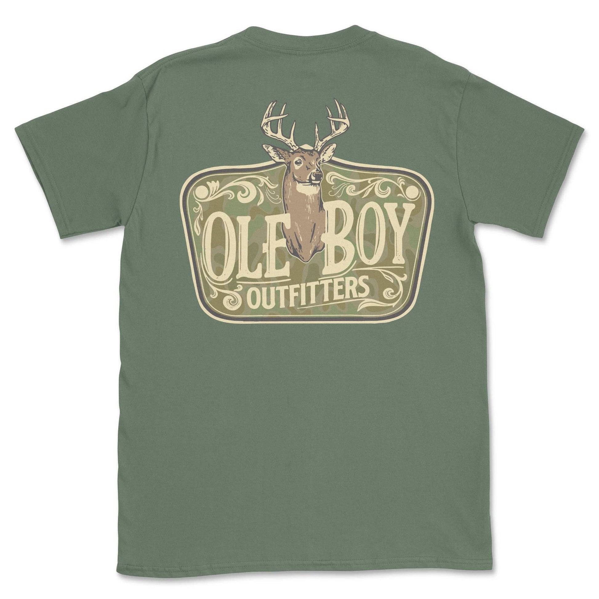 This OLE BOY Buck Mount Tee from ole boy outfitters is perfect for any hunting or outdoor enthusiast. Made with 100% ring spun cotton, it offers superior softness and comfort. The camo background and mounted buck design add a touch of rugged charm. Show off your love for the great outdoors with this tee Ole Boy!