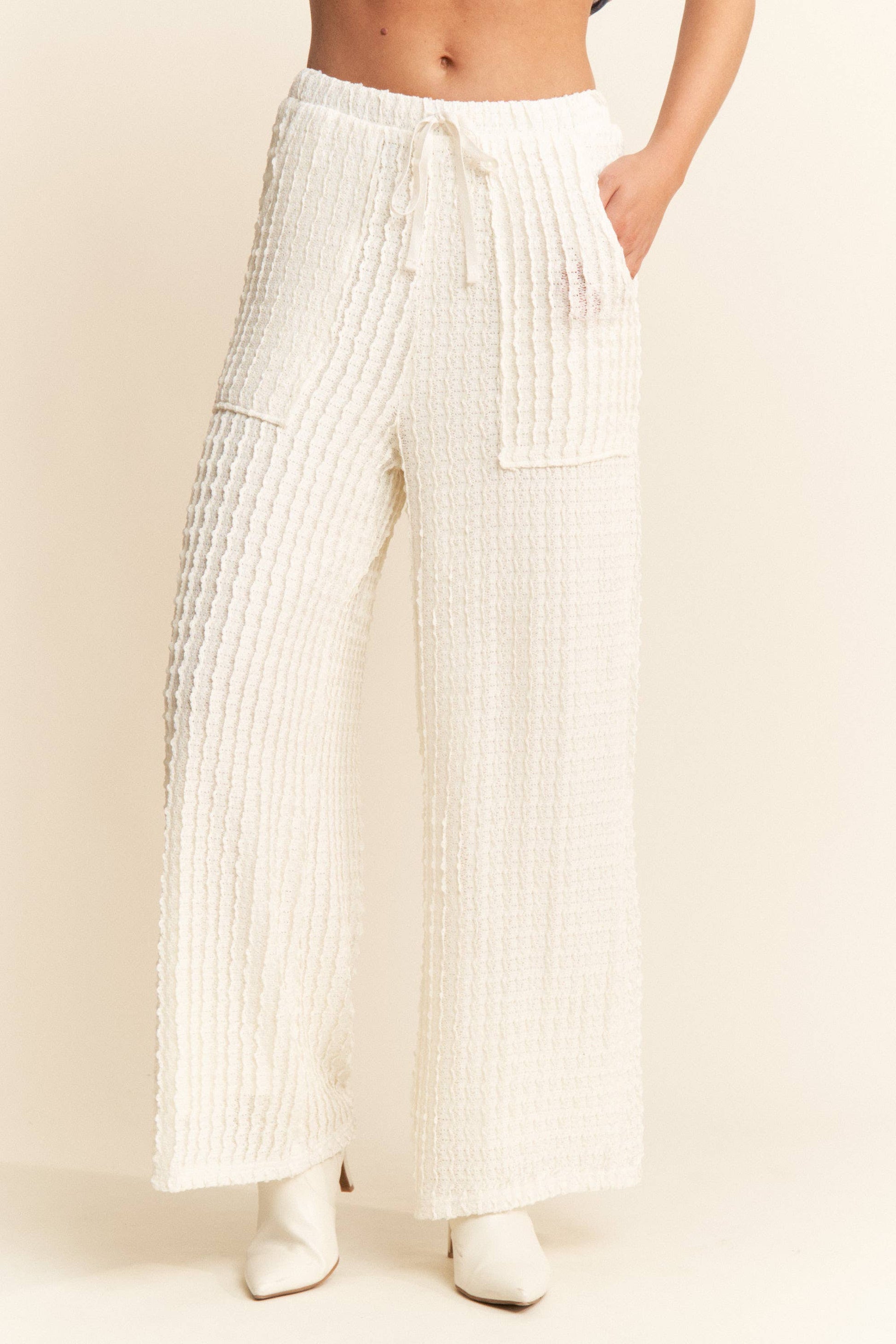 Women's textured full length straight leg pants. Elastic waist band, draw string and pockets.